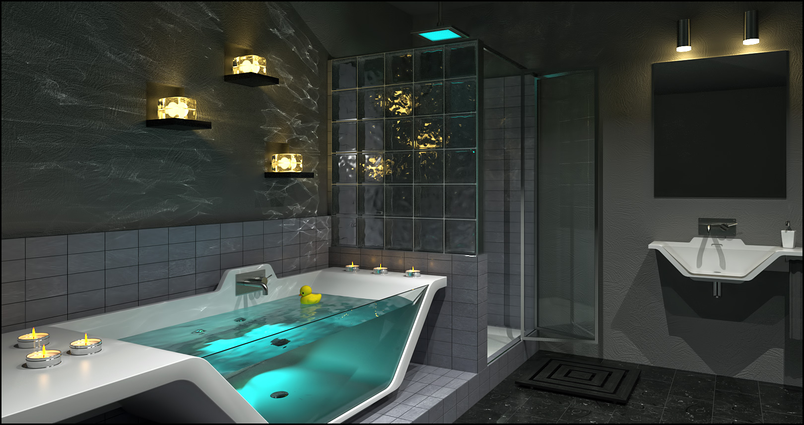 Armed with a good model capable of producing nice caustics I set about creating a scene that would showcase these qualities. I knew I wanted to to do something based around Harri Koskinen's Block Lamp (which turned into a side project of its own) and my own interpretation of Us Together's Ebb range of bathroom furniture. Other than that I just wanted to create a very simple scene that would allow me to experiment with dramatic lighting and the caustic effects produced by my glass block models.