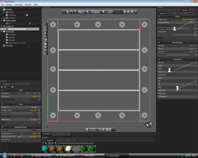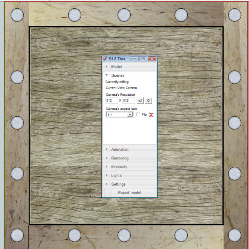 Change the view in Sketchup to top and zoom in until it fills the work area top and bottom. Open the Sketchup to Thea plugin, set the scene resolution to 512×512, our object needs to fit in the red square. I tried both ways, having Sketchup in parallel and perspective view and found perspective better, but it doesn’t matter really.